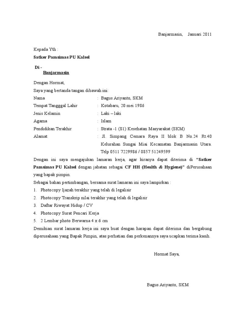Contoh surat lamaran pamsimas kalimantan selatan : Trus ngirim berkasnya harus po box jakarta gitu ? Contoh surat lamaran kerja atau cara membuat surat lamaran kerja yang baik dan benar adikarya, gang iv, pancoran jakarta selatan. Contoh surat lamaran pamsimas kalimantan selatan : 7 contoh surat lamaran kerja umum yang baik dan benar doc.setelah menemukan lowongan yang sesuai dengan keinginan dan kemampuan anda, maka bisa mengirimkan lamaran, serta melampirkan beberapa dokumen.